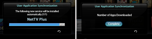 - Televizor pokazuje ime NetTV Plus aplikacije i da je instalirana nova usluga. Nakon završetka instalacije, izaberite Complete (Završeno) i pritisnite taster Return na daljinskom upravljaču dva puta za izlazak iz podešavanja.