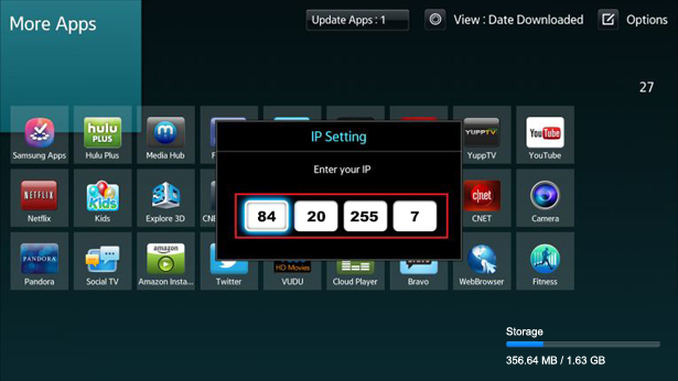 - Hover over any already installed app and then press and hold ENTER button on your remote control until menu (pictured bellow) shows up. Choose IP Setting.